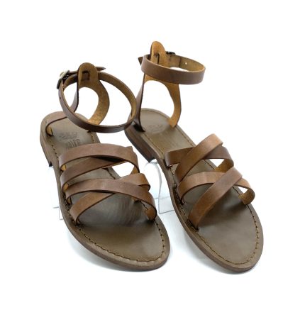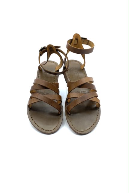 Sandali artigianali per donna con fasce in pelle e cinturino ad incrocio sul tallone e caviglia.