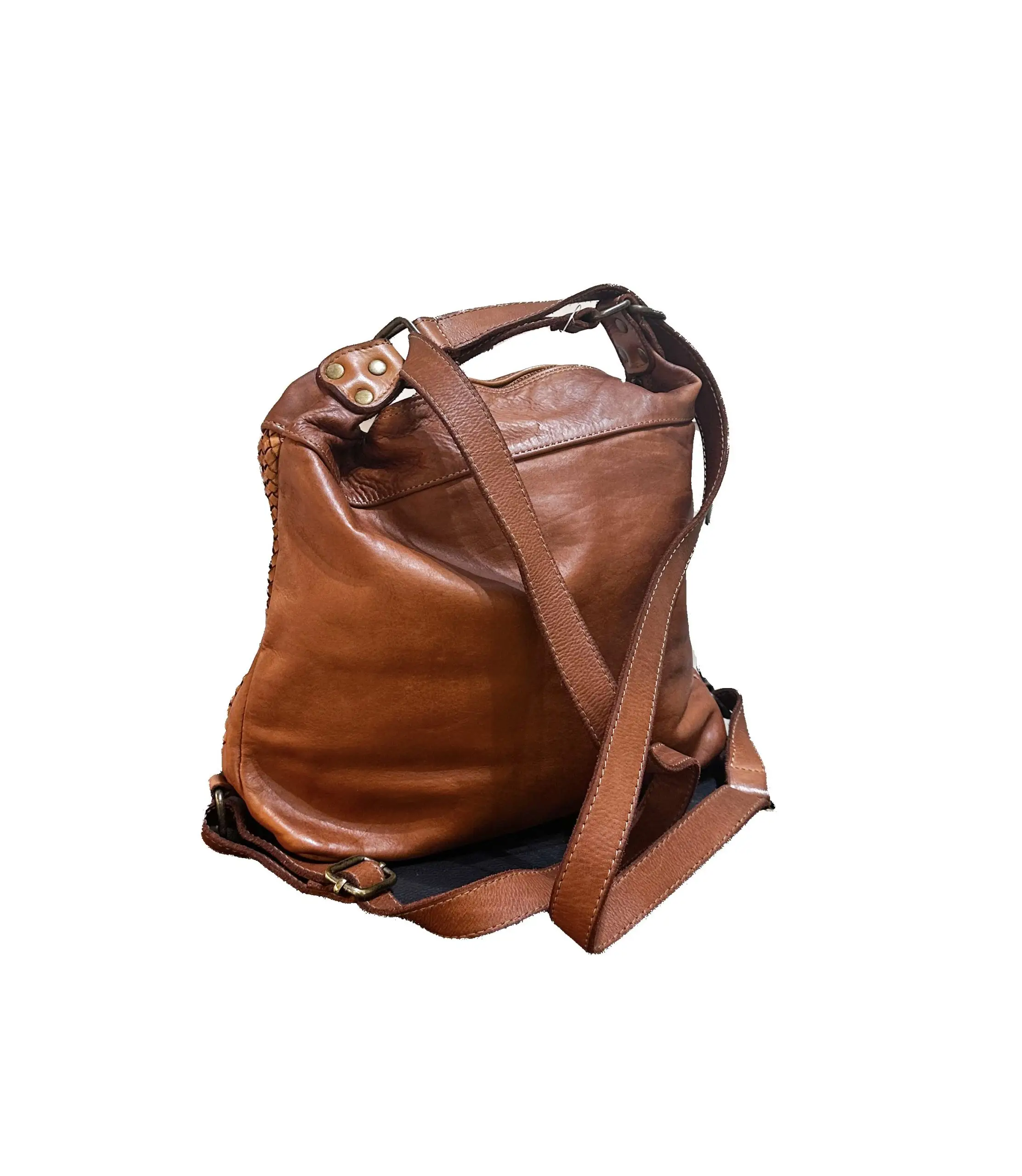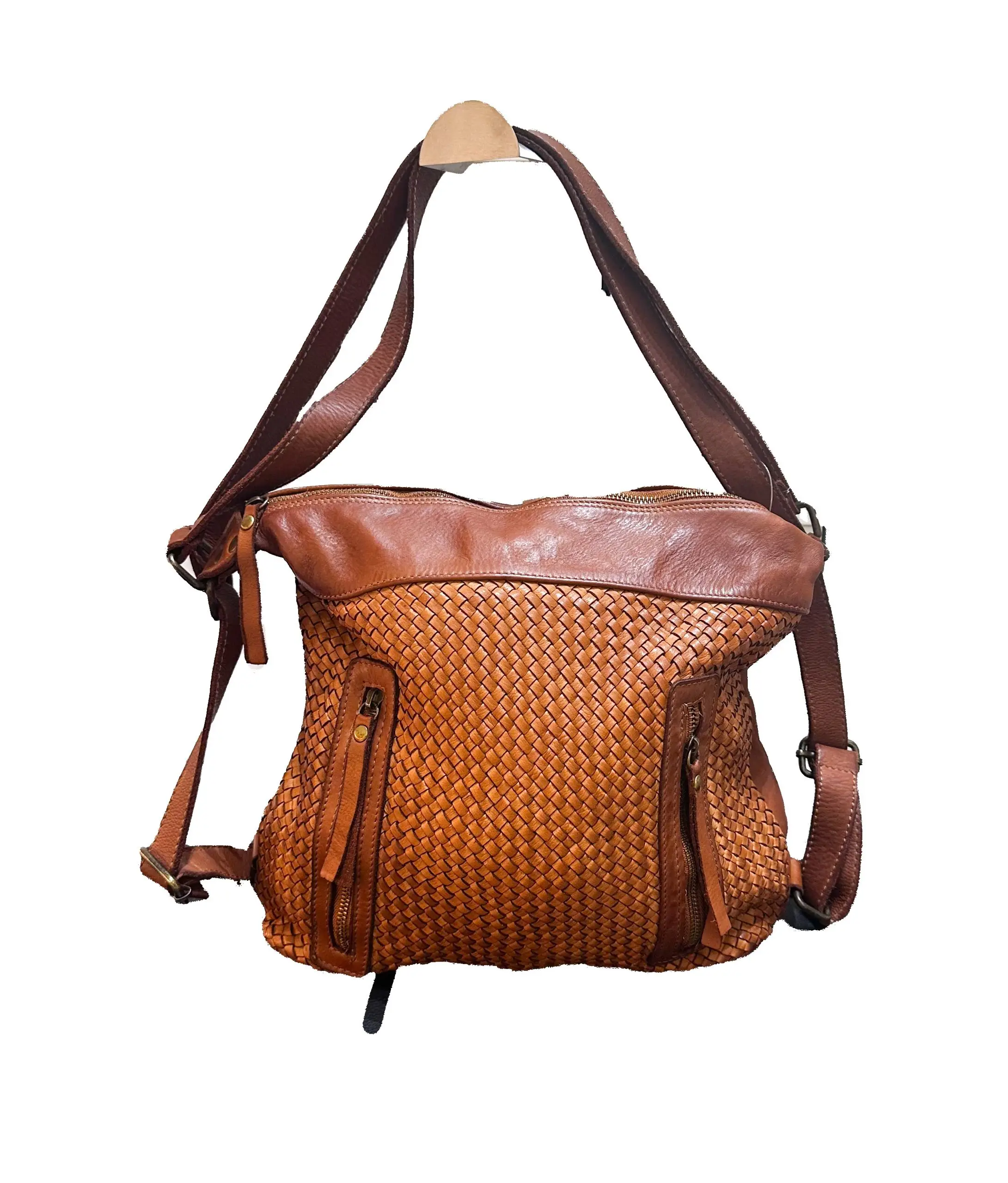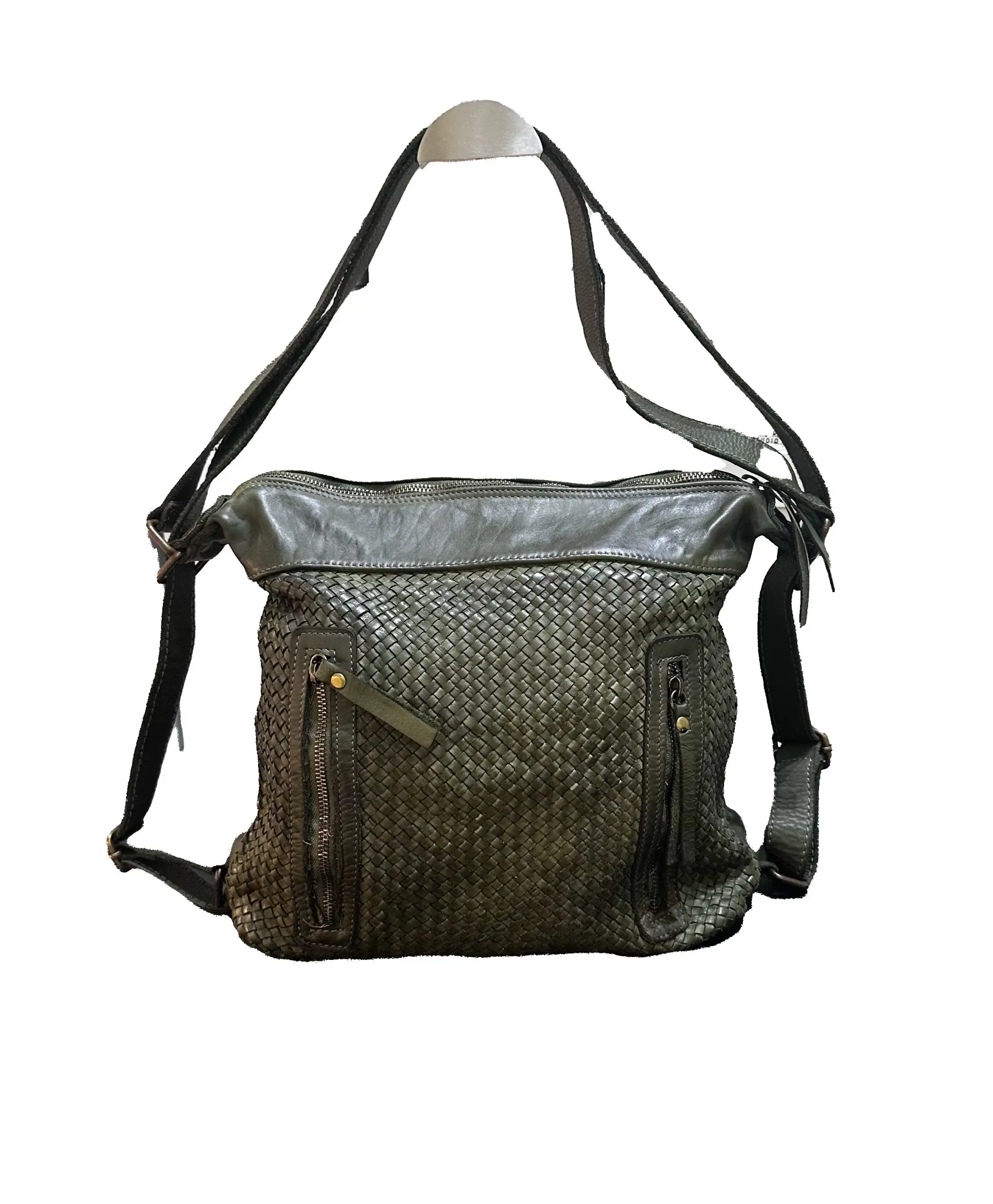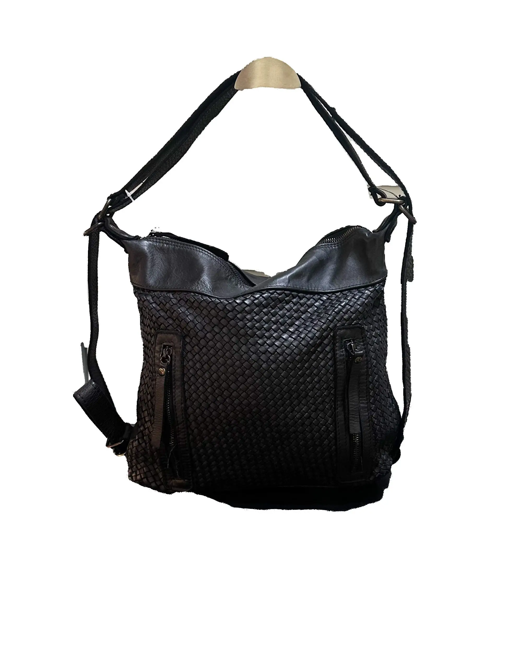 Discover the genuine leather bag/backpack that combines artisanal elegance with maximum practicality. The woven leather front, rich in details and charm, perfectly matches the smooth leather back, creating a refined and timeless contrast. Thanks to adjustable side straps, it transforms from a shoulder bag into a comfortable backpack in just a few steps, accompanying you in style on any occasion.