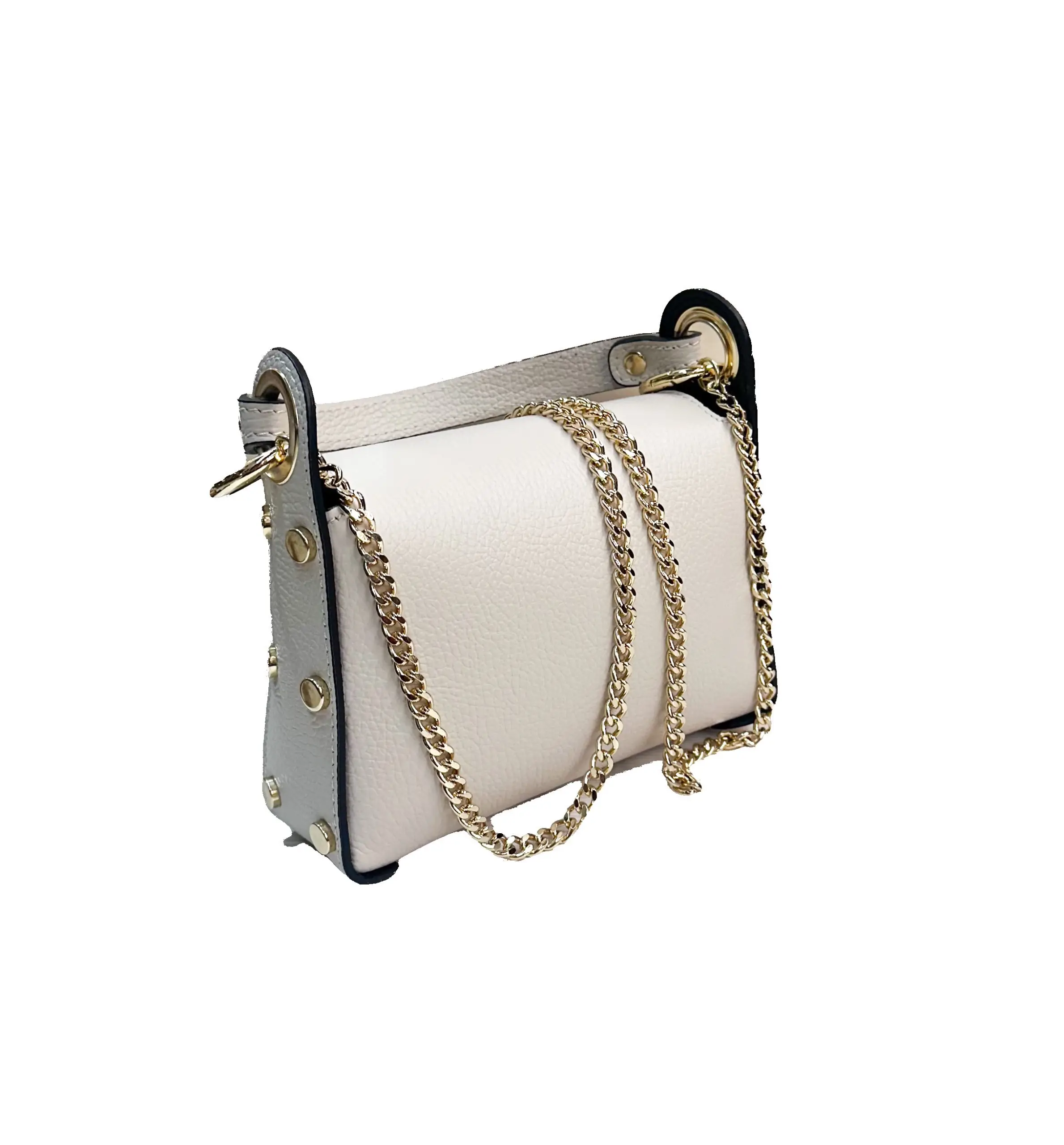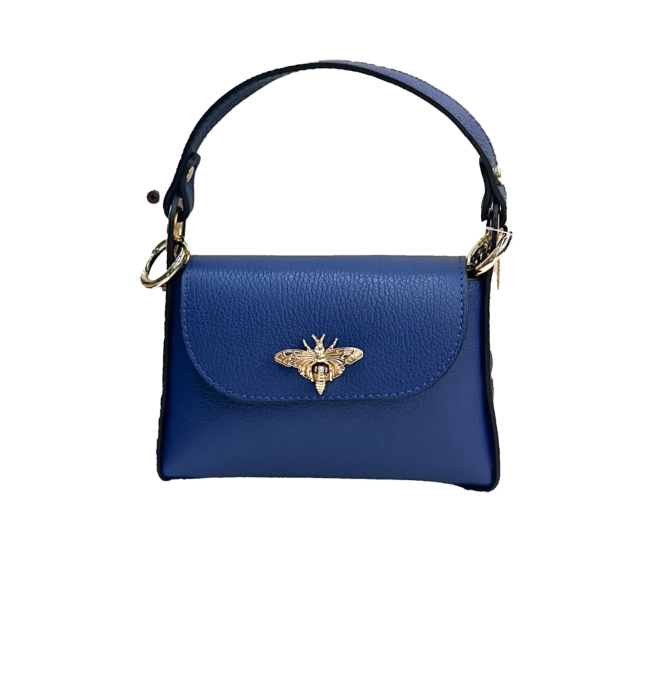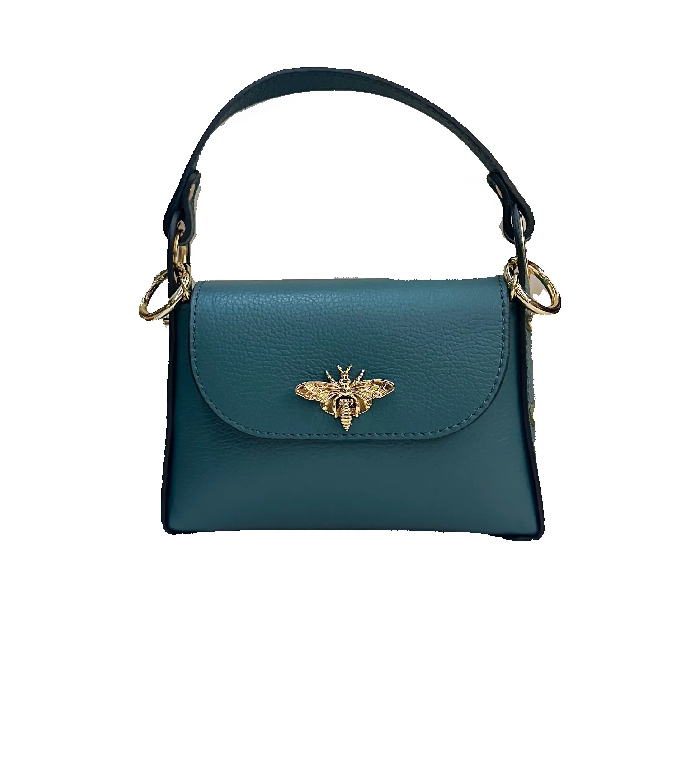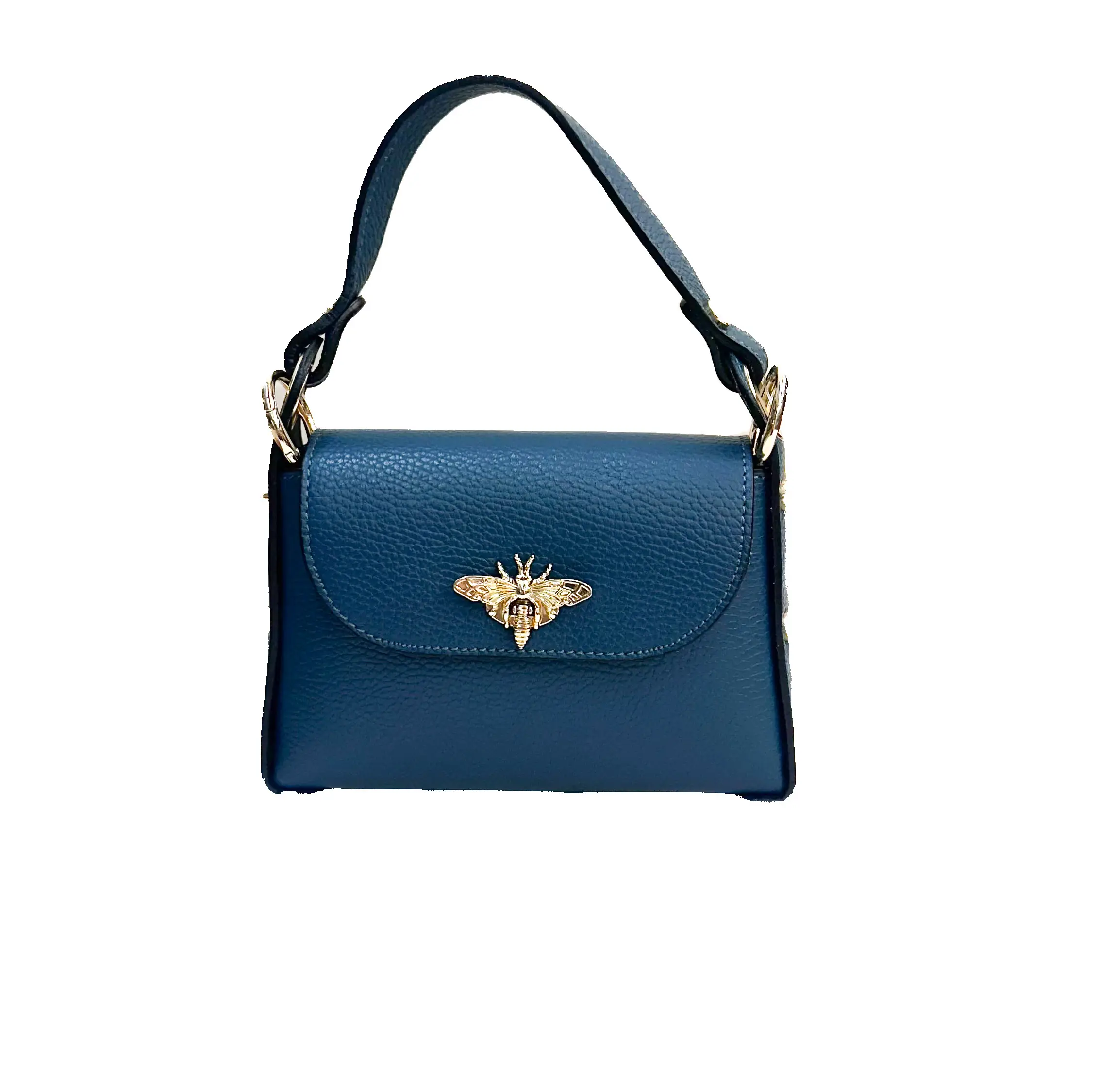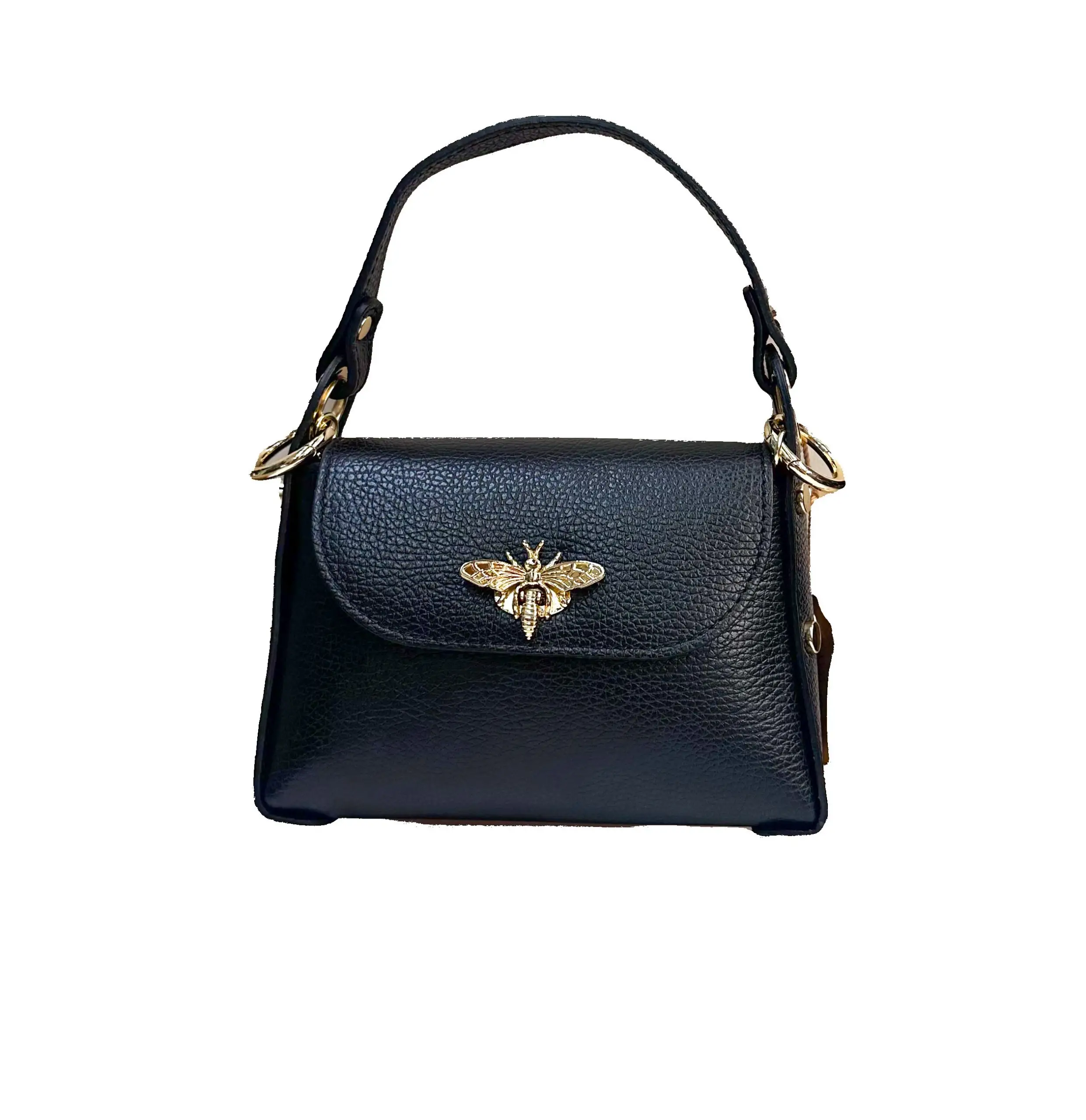 Bolso de piel de alta calidad, caracterizado por detalles dorados. El frontal está embellecido con un refinado inserto en forma de abeja, símbolo de estilo y refinamiento. Dotado de asa superior y bandolera con cadena, ofrece la versatilidad de llevarse tanto de mano como al hombro o en bandolera.