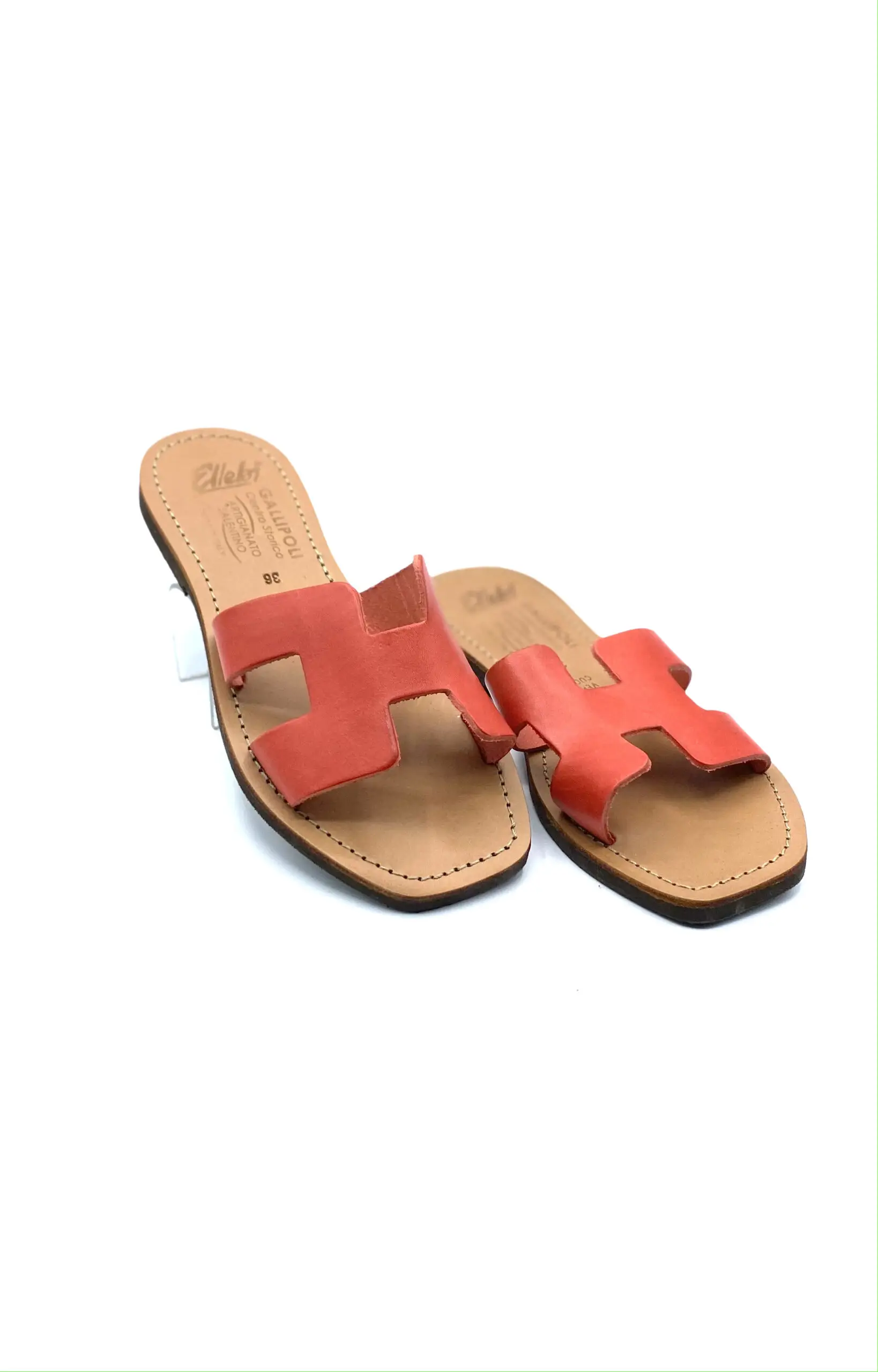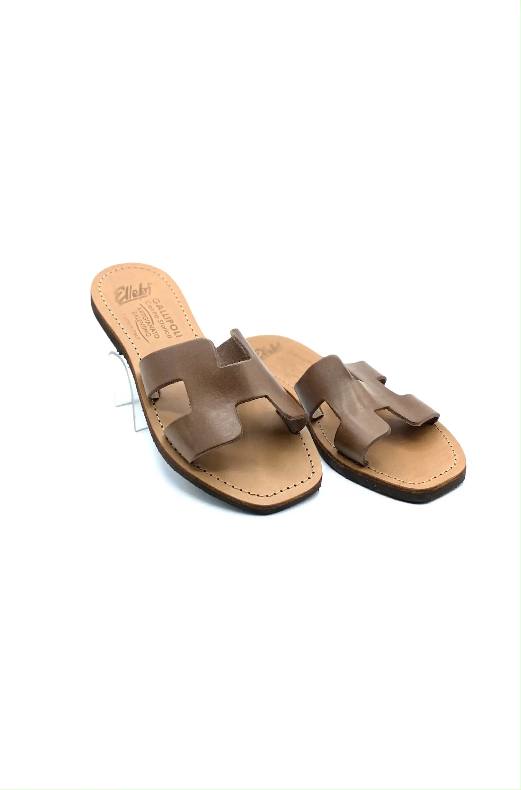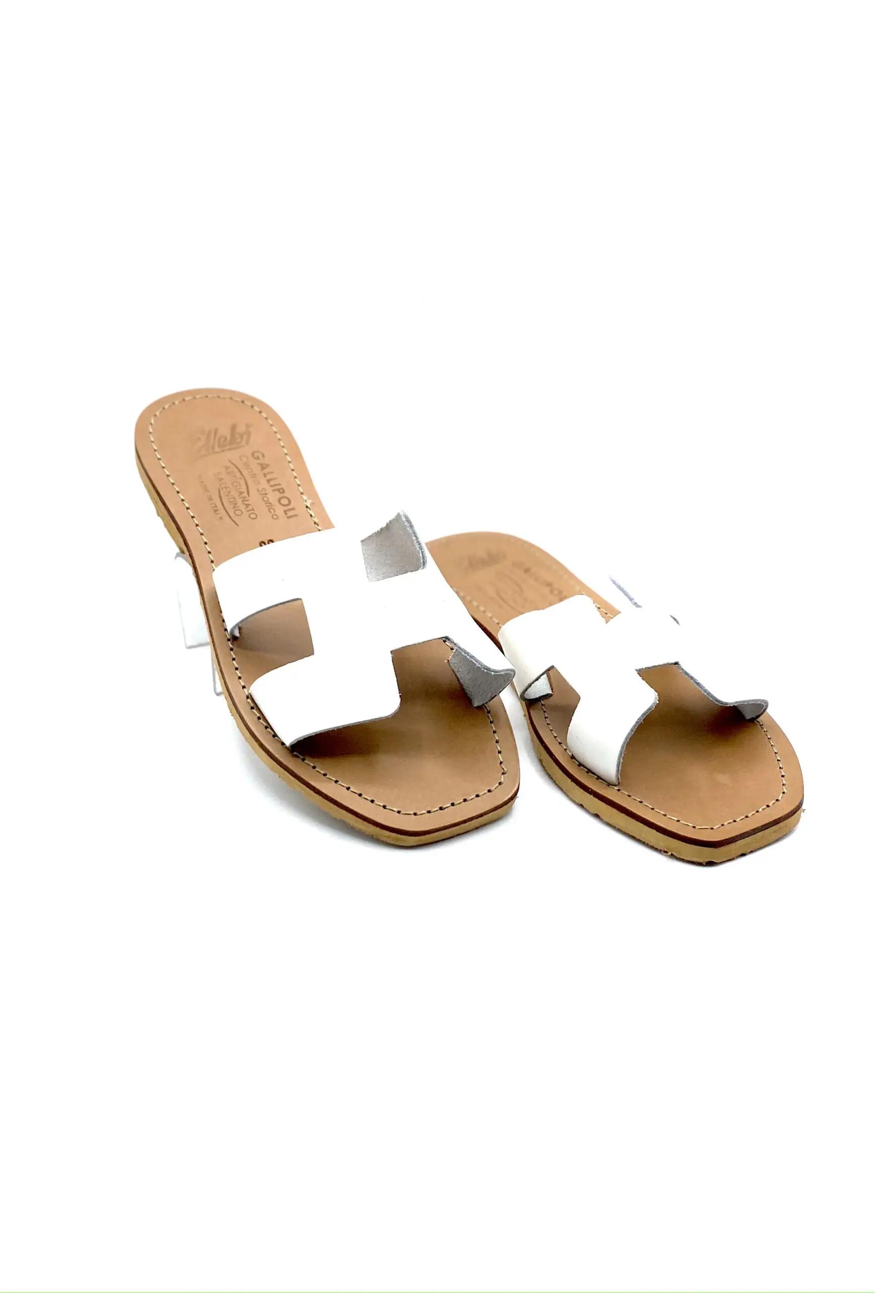 Sandalias artesanales planas para mujer, modelo Hermes, con punta cuadrada. Empeine de piel vacuna, plantilla de cuero y suela de goma micro aligerada.