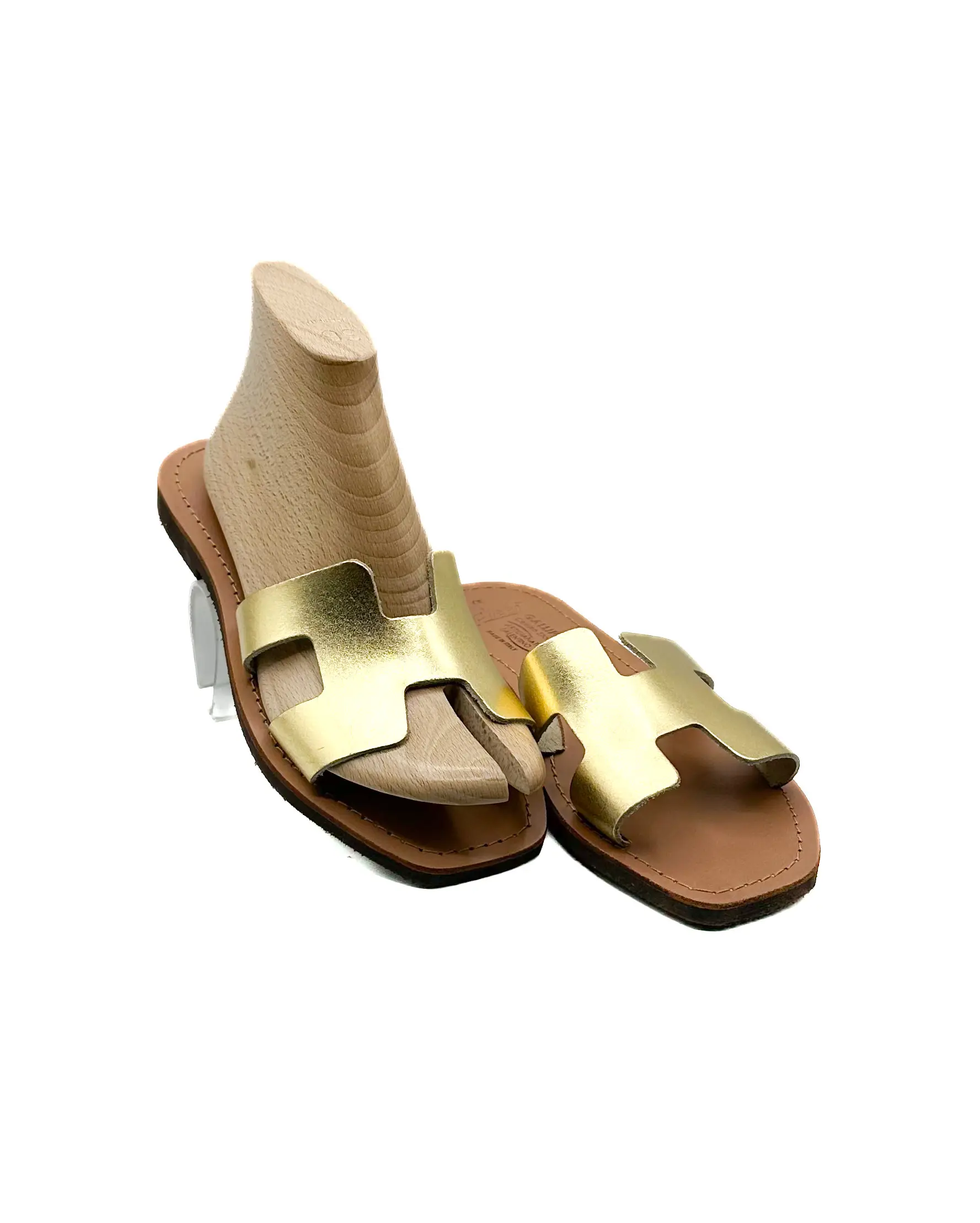 Sandalia artesanal plana para mujer, modelo Hermes, con punta cuadrada. Empeine de piel vacuna, plantilla de cuero y suela de goma micro aligerada.