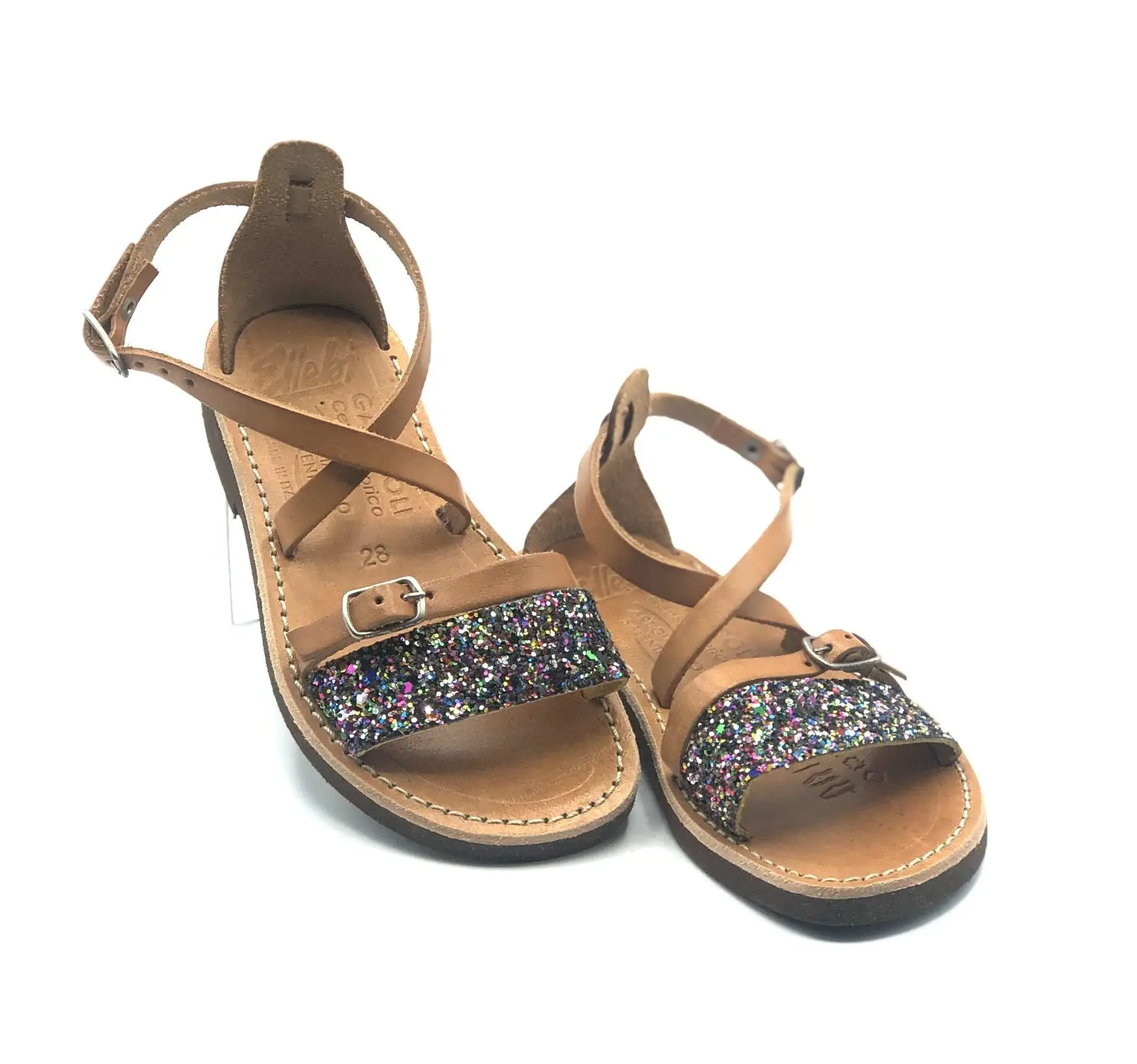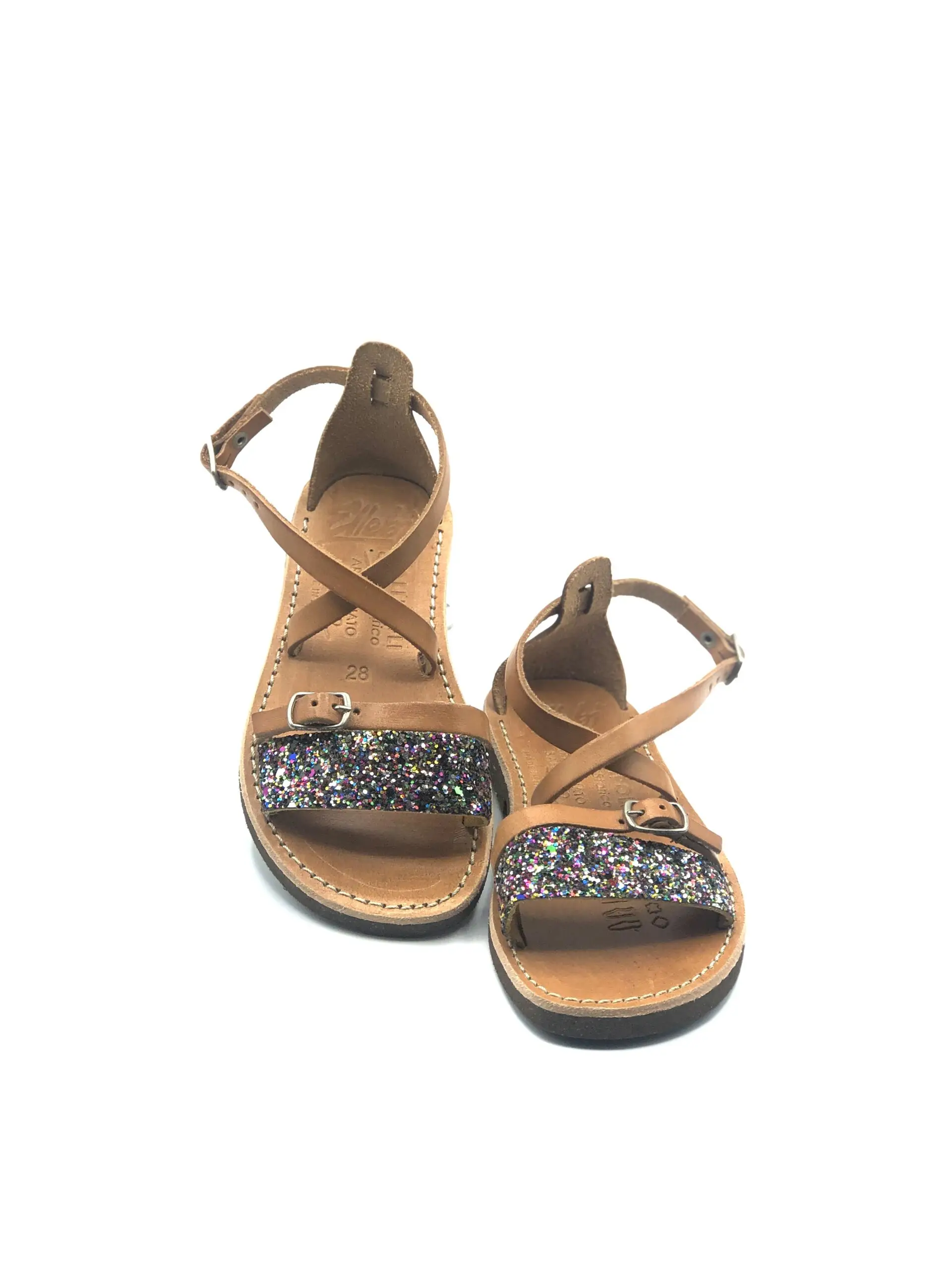 Sandalias artesanales para niña, con tira de purpurina y hebilla ajustable, cruce sobre el empeine, talón abierto y pulsera en el tobillo. Parte superior de piel de vacuno y plantilla de cuero.