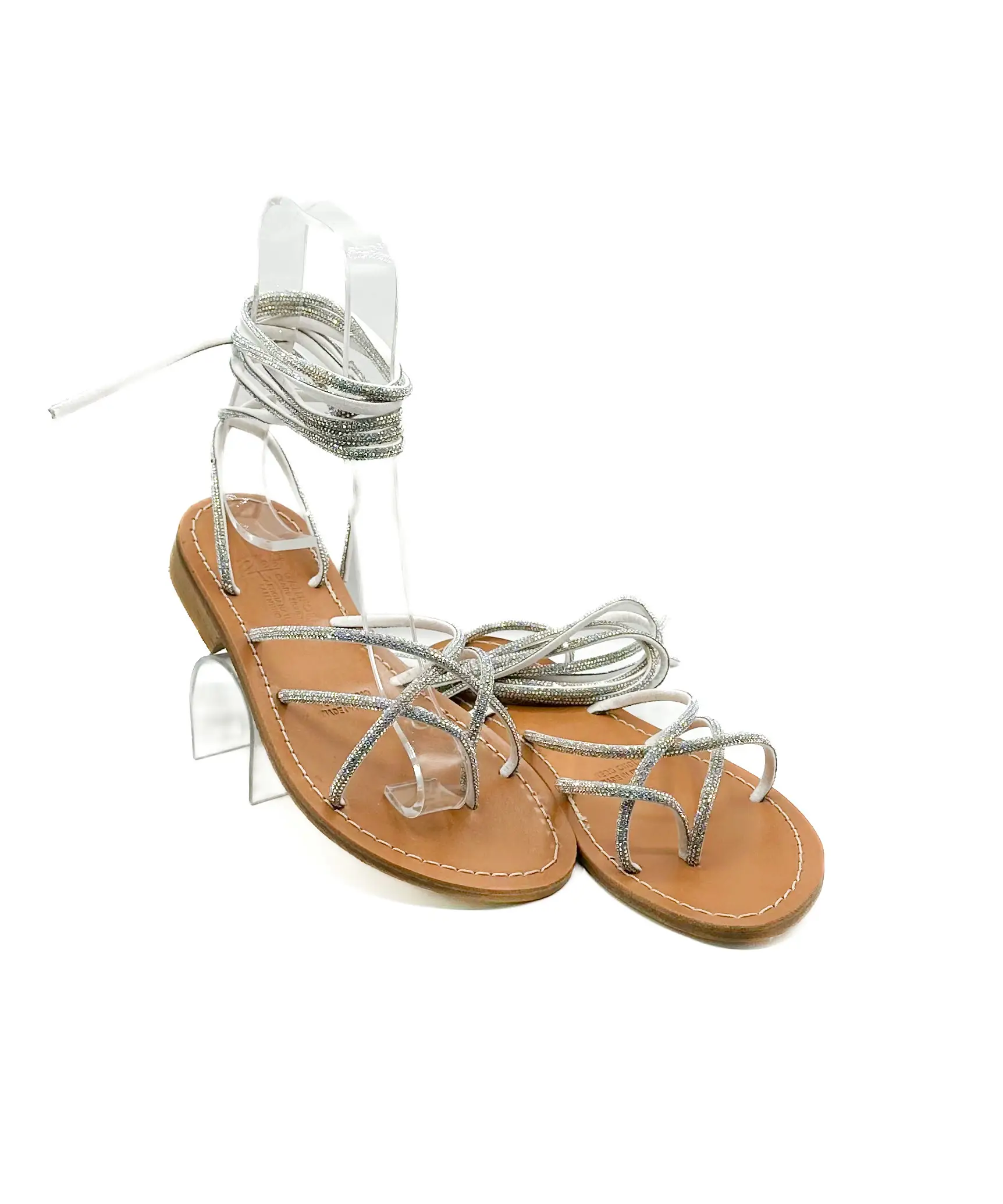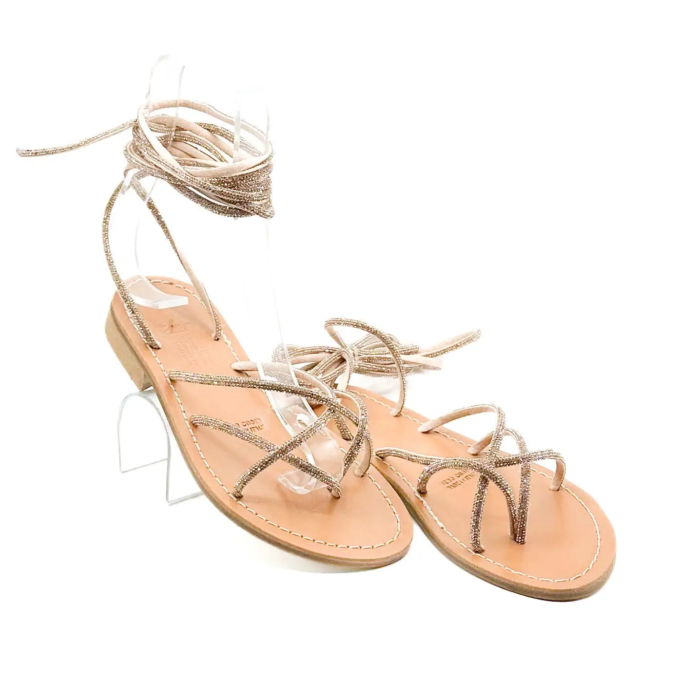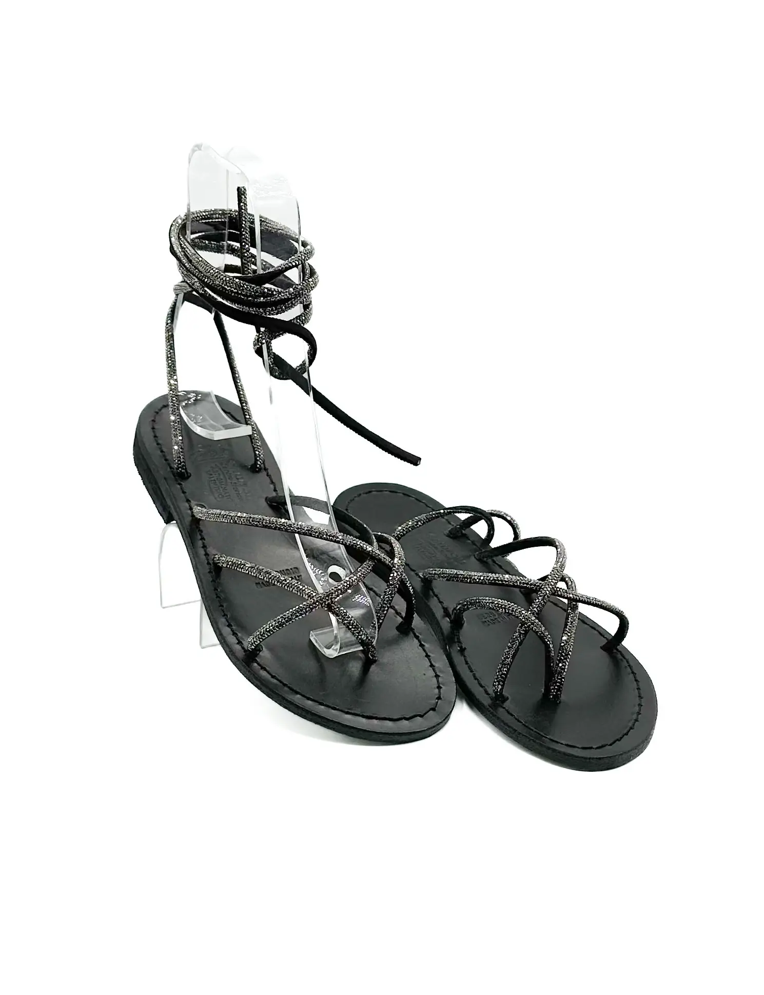 Sandalias artesanales para mujer con tira entre dedos y cordones elaborados con aplicaciones tubulares de pedrería para calzado. Plantilla y suela de cuero. Productos elaborados por artesanos salentinos que utilizan materiales de primera calidad. Calce regular.