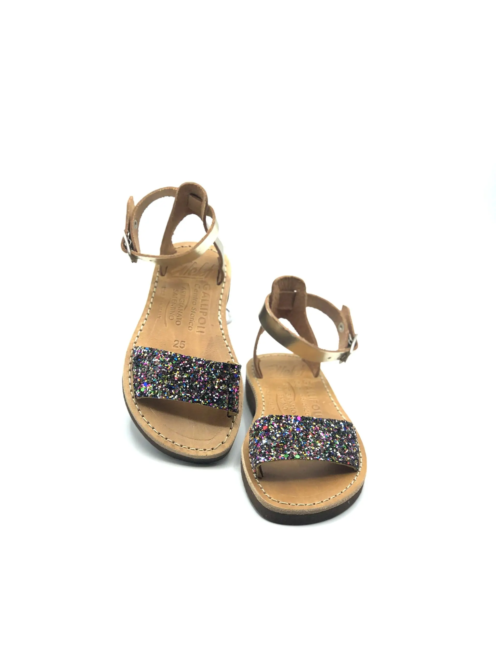 Sandalias artesanales para niña, en piel con banda glitter, pequeño espolón abierto y pulsera en el tobillo. Producto realizado por artesanos italianos.