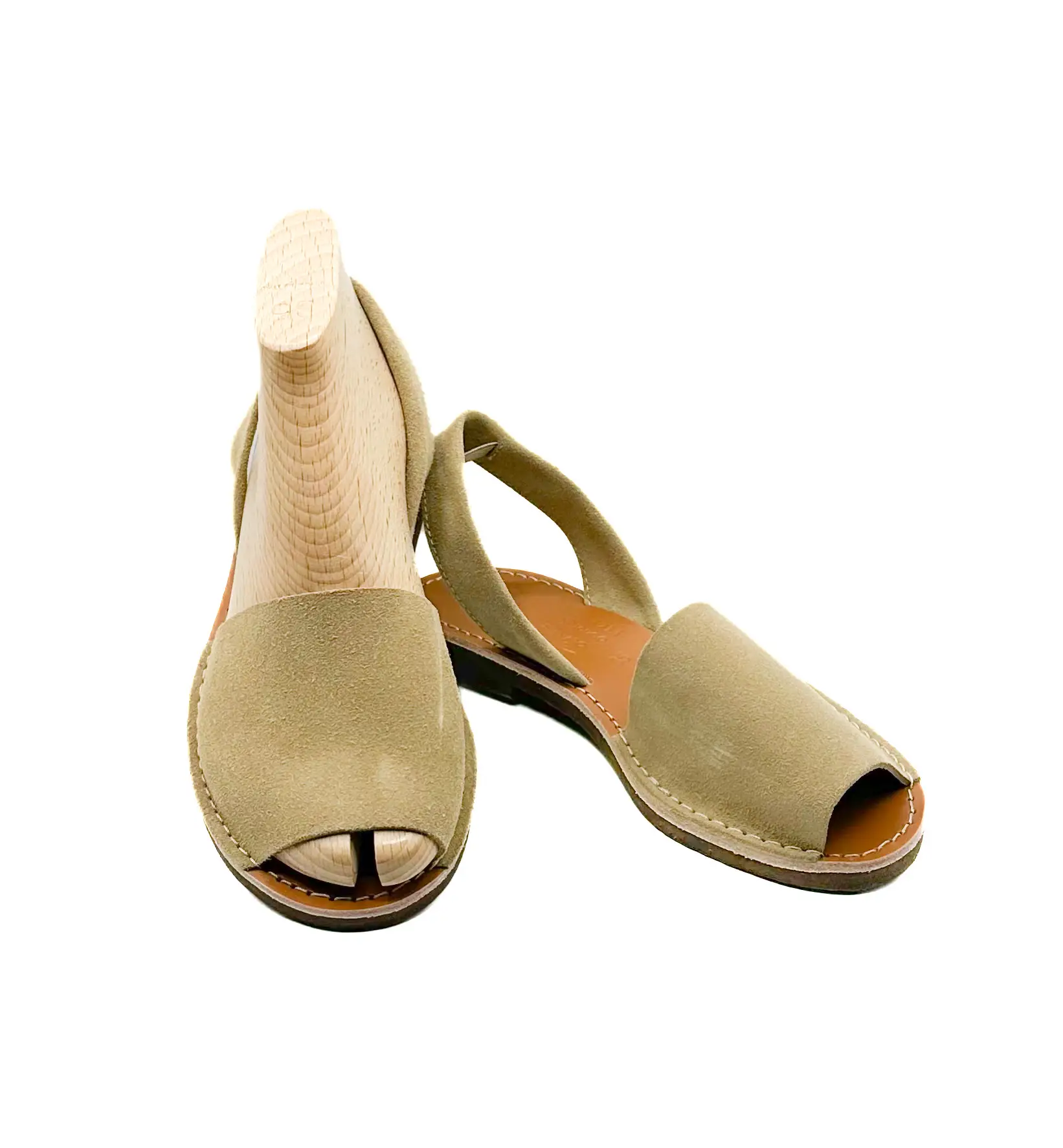Minorquines artisanales pour femme, en daim beige. Semelle intérieure en cuir et semelle en gomme légère. Maintien à la cheville par élastique. Réalisées à la main par des artisans du Salento.