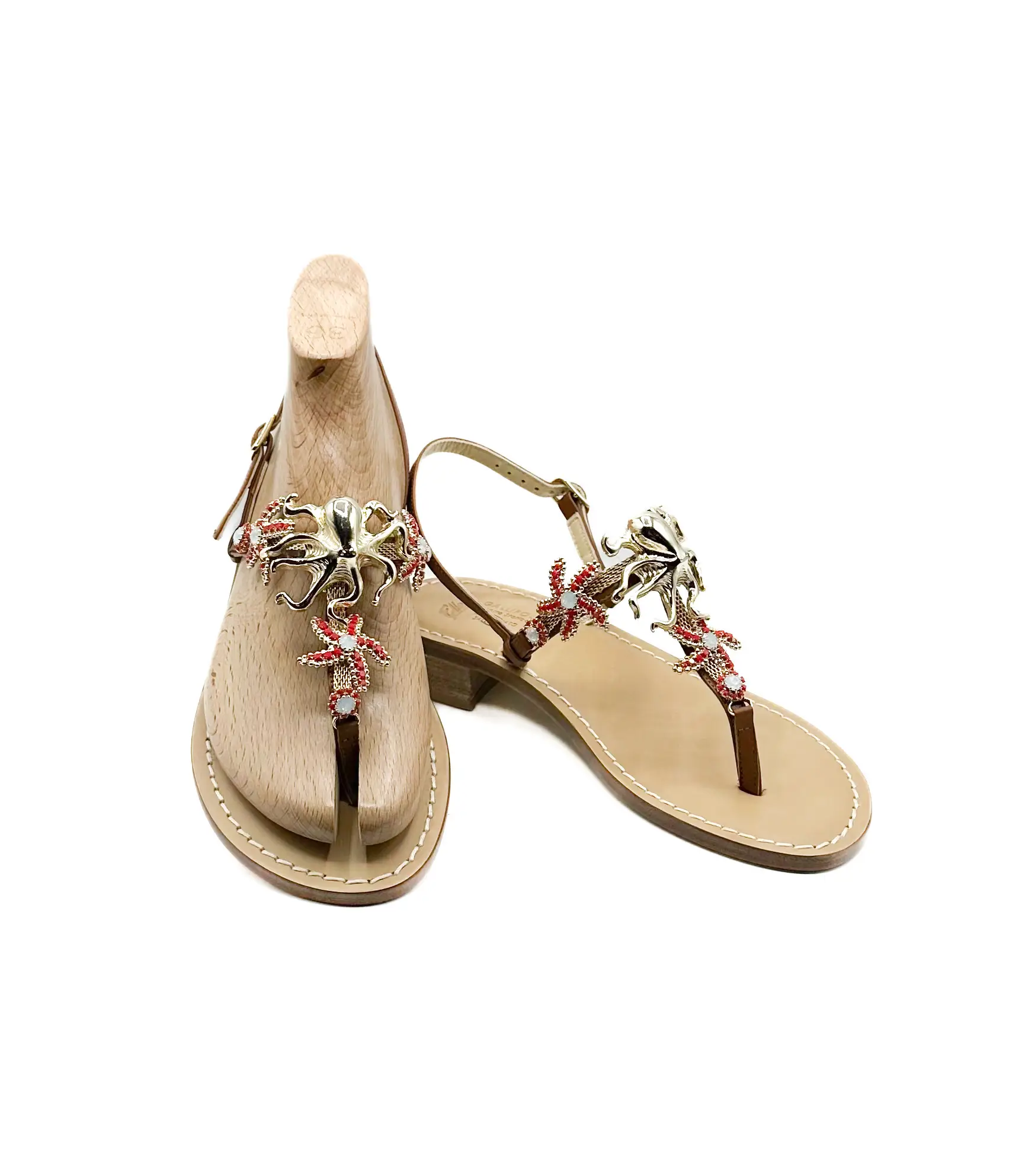 Sandales bijoux artisanales en cuir naturel avec application inspirée du monde marin. Le détail poulpe apporte élégance et caractère à chaque look estival.