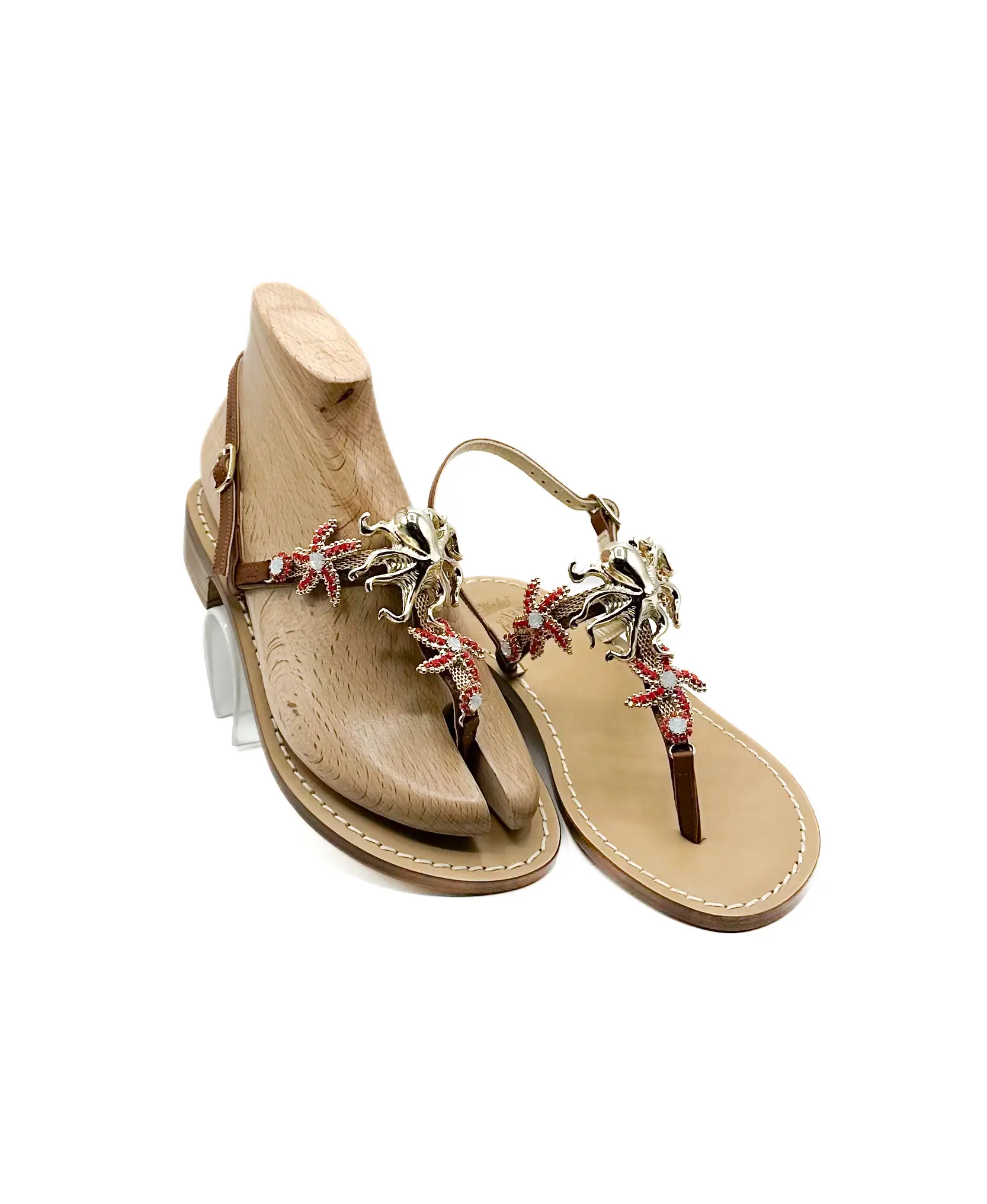 Sandales entre-doigts entièrement réalisées en cuir italien de haute qualité, travaillées et finies à la main. La tige est agrémentée dune élégante application bijou inspirée du monde marin, avec un motif poulpe et des détails corail, conçue pour apporter lumière et personnalité au design. La structure garantit confort et stabilité, tandis que la semelle en cuir assure respirabilité et durabilité.