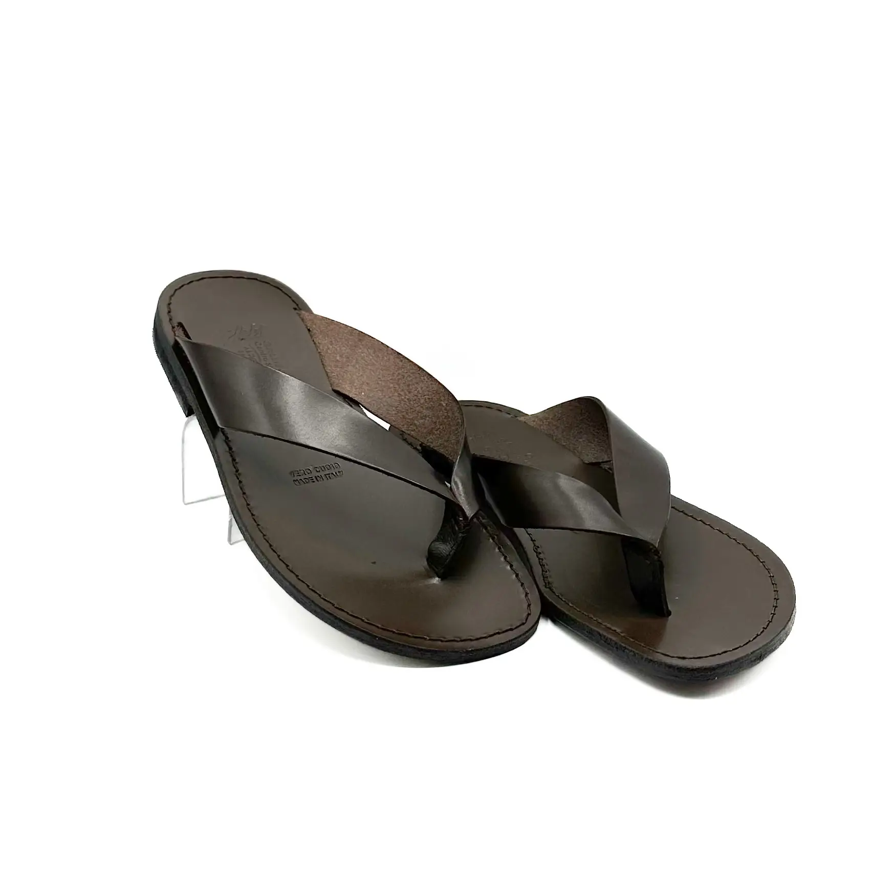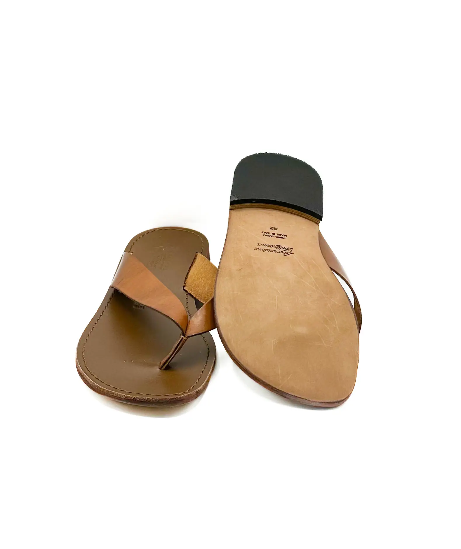 Tongs artisanales en cuir pour homme, fabriquées à la main par des artisans du Salento. Dessus en cuir de vache, semelle intérieure et extérieure en cuir. Chaussant régulier.