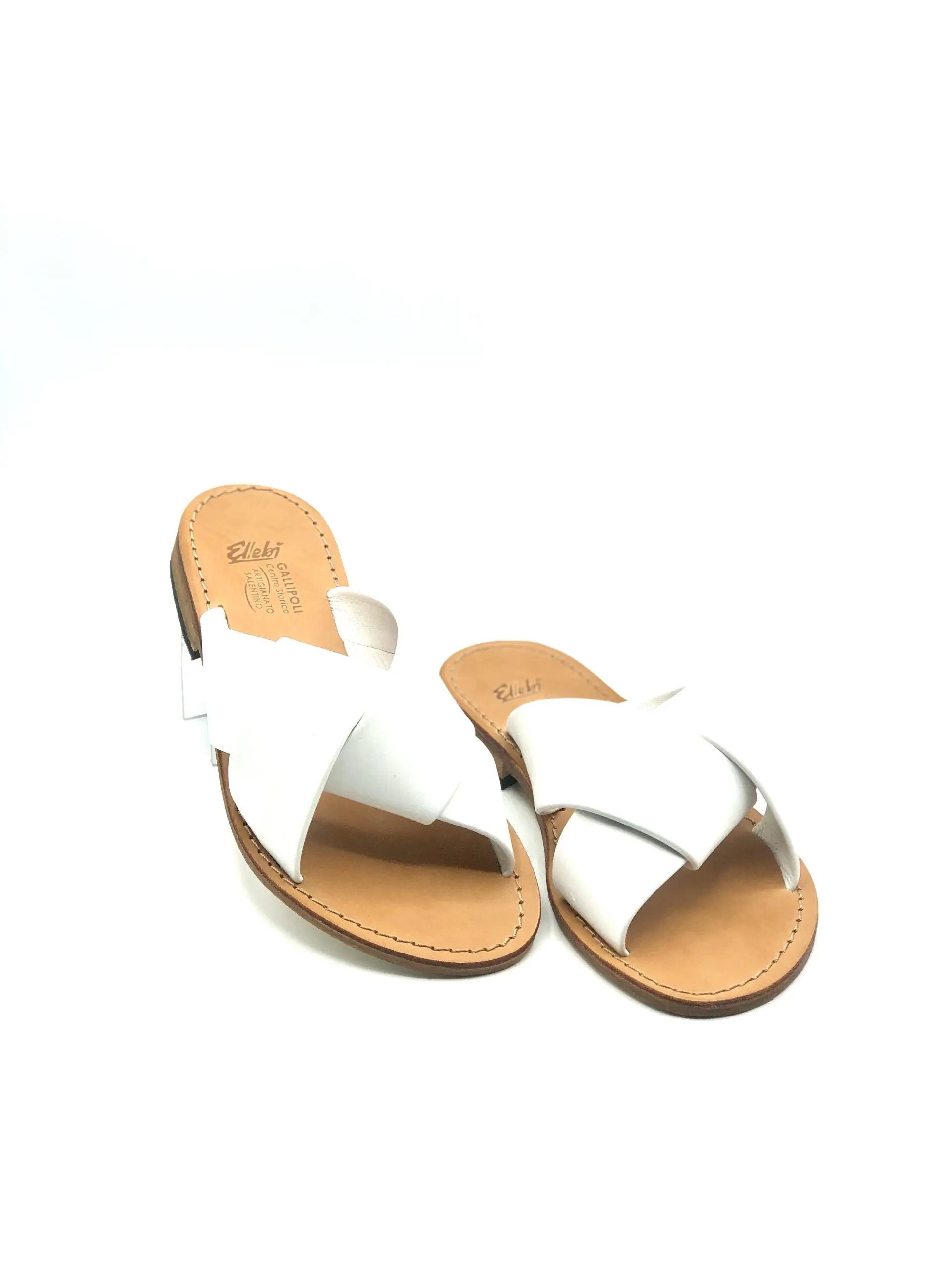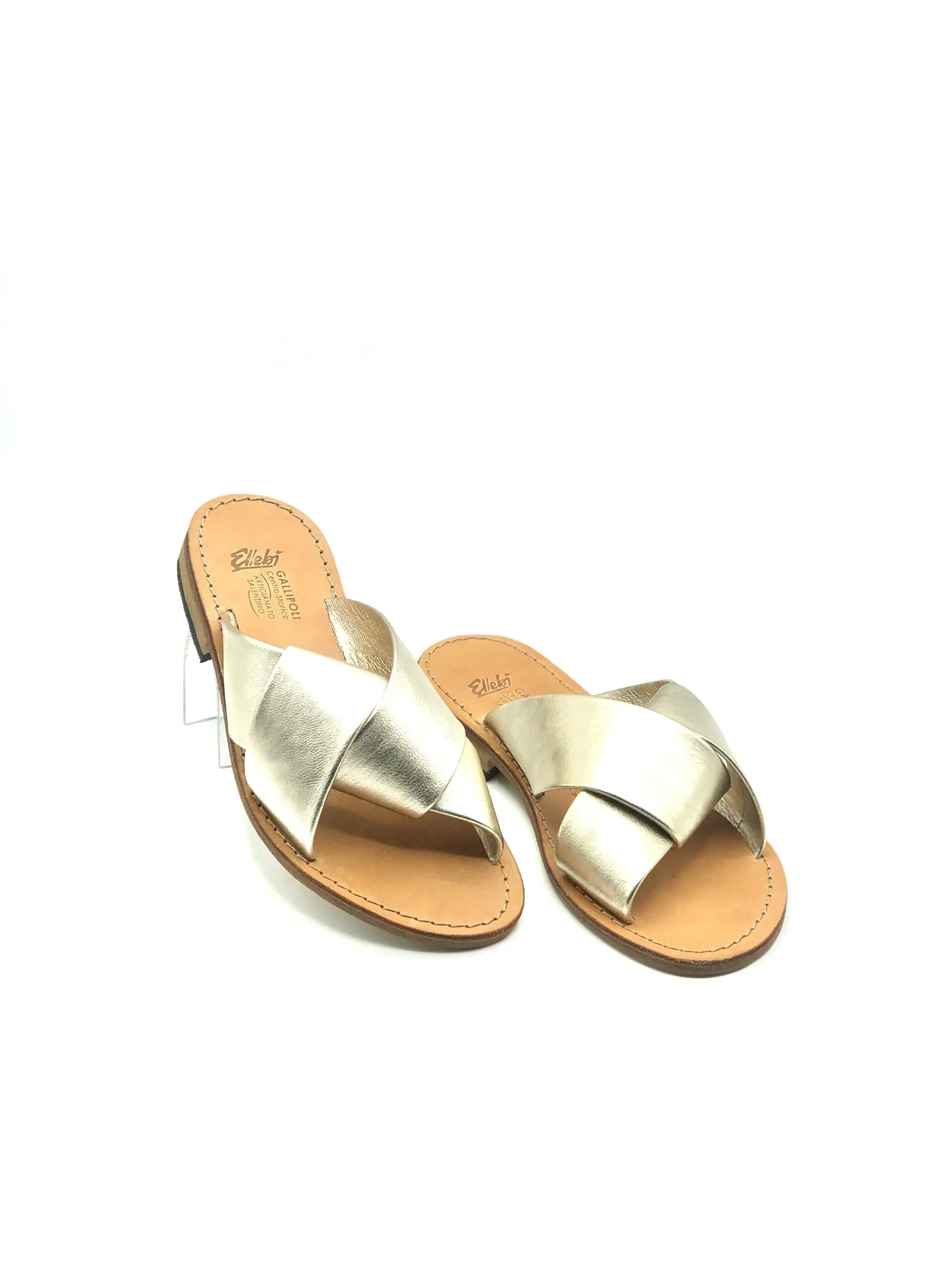 Ciabatte artigianali da donna con fascia tubolare in pelle incrociata su se stessa. Tomaia in vitello morbido, plantare in cuoio e fondo in cuoio.