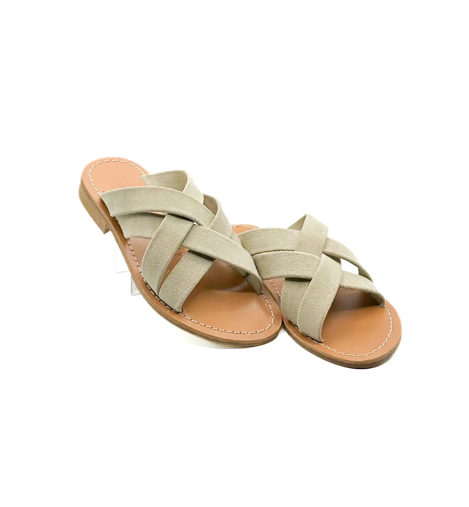 Ciabatte artigianali per donna con fasce intrecciate in pelle scamosciata. Tomaia in camoscio, plantare in cuoio e fondo in cuoio. Prodotti realizzati da artigiani salentini con materiali di prima qualità. Calzata regolare.