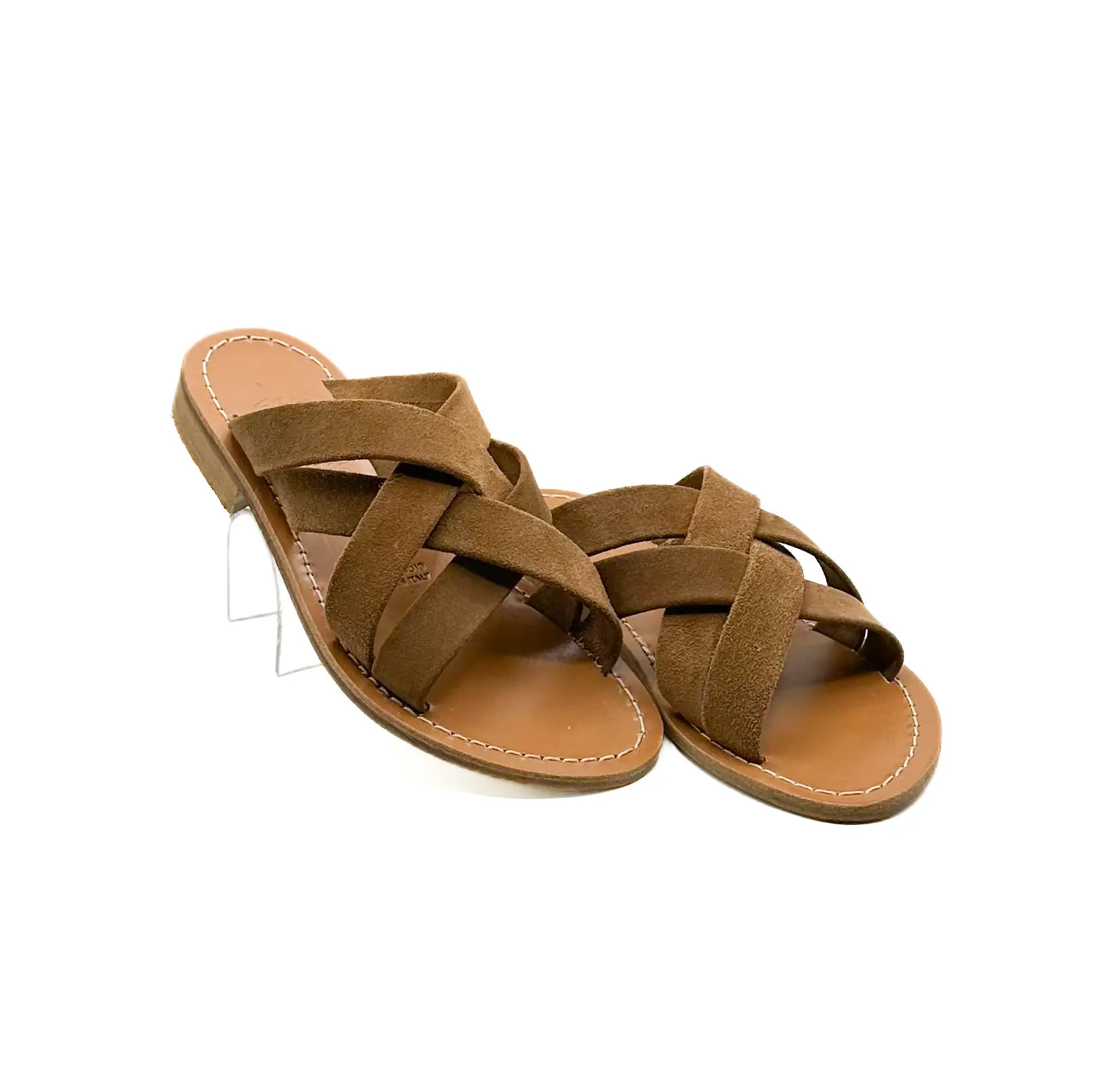 Ciabatte artigianali per donna con fasce intrecciate in pelle scamosciata.