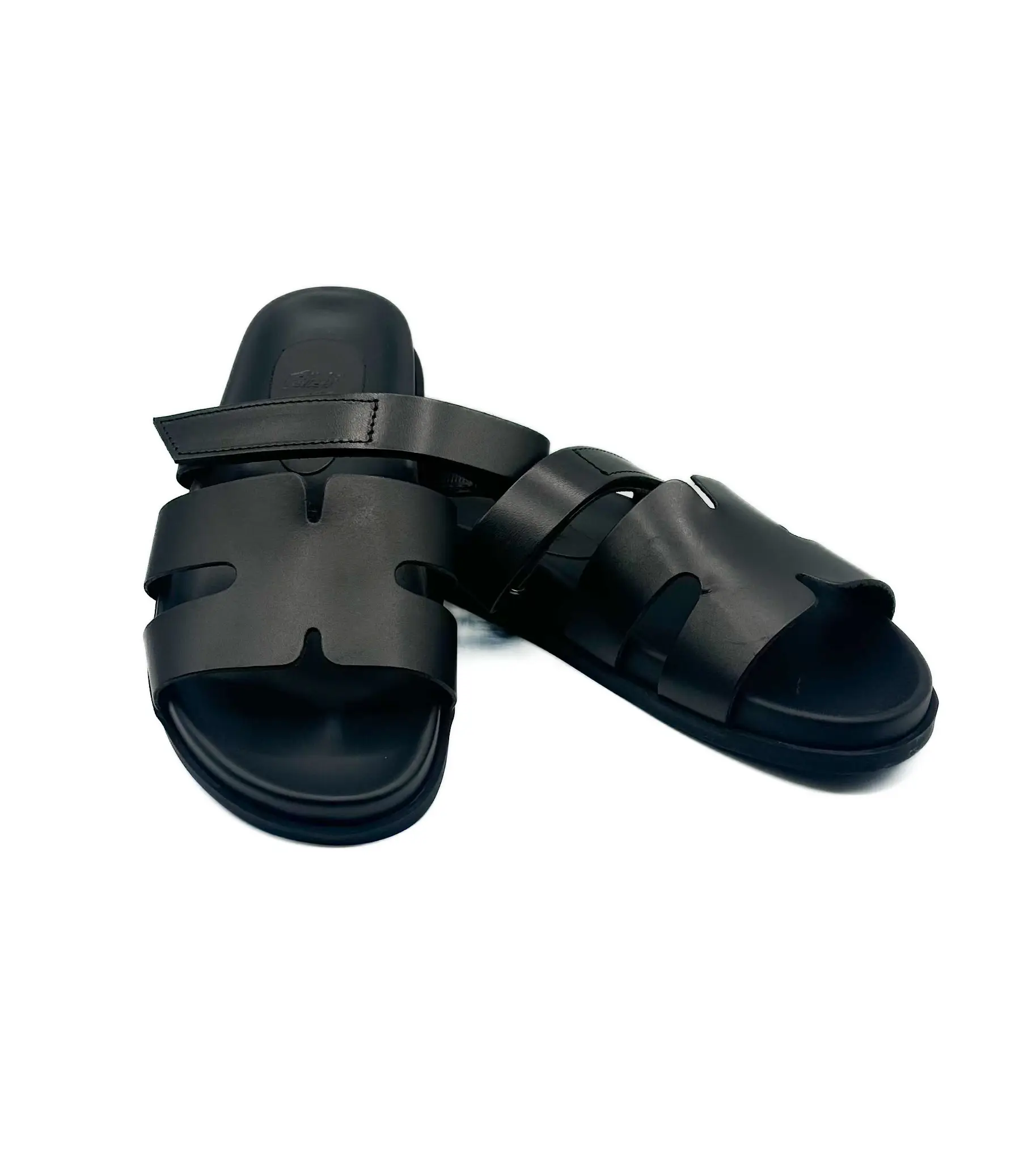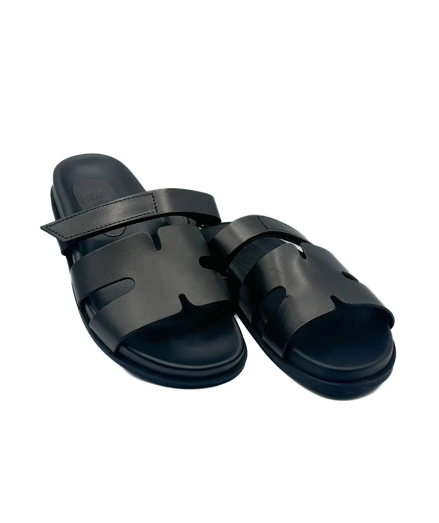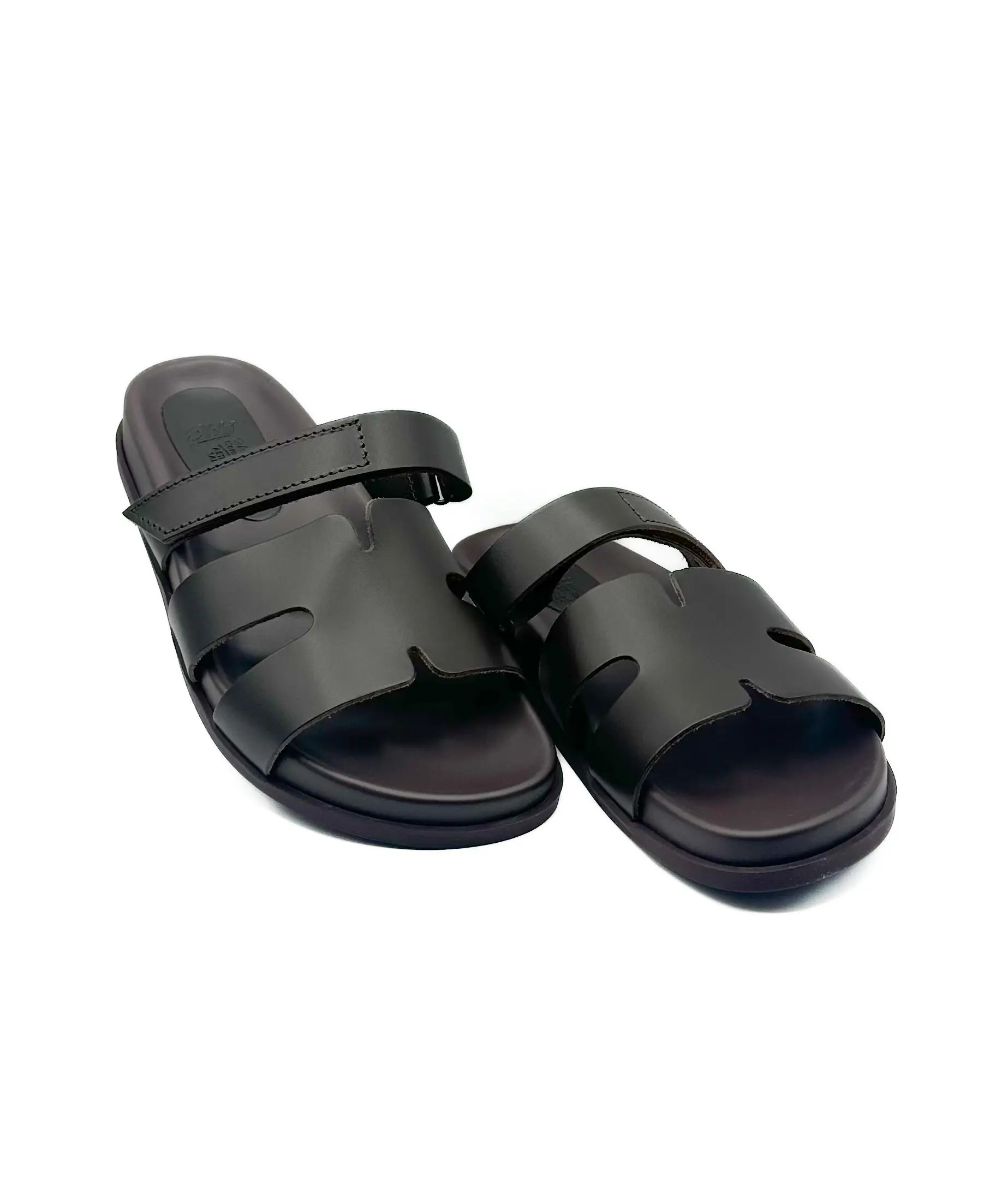 Ciabatte artigianali da uomo modello H realizzate in pelle. La tomaia richiama il modello “Hermès” con cinturino regolabile in velcro per una calzata personalizzata e stabile. Plantare anatomico progettato per offrire comodità e supporto durante l’uso, con suola robusta e resistente. Prodotto realizzato artigianalmente.