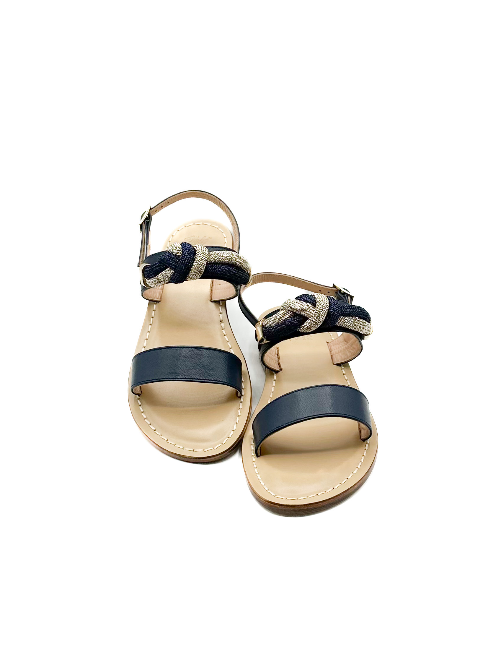 Sandali gioiello artigianali per donna, con due fasce di cui una impreziosita da un nodo realizzato con tubolare di strass adatto alle calzature. Tomaia in pelle, fodera in pelle, chiusura con tracolla sul tallone, plantare in cuoio imbottito e fondo in cuoio con tacco 3cm. Calzata regolare.