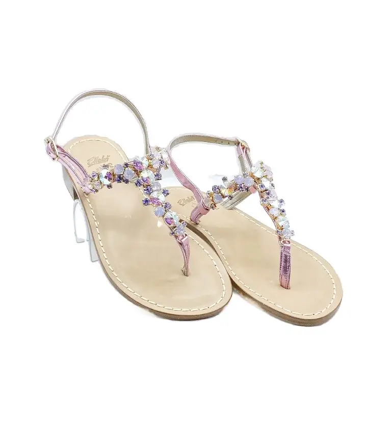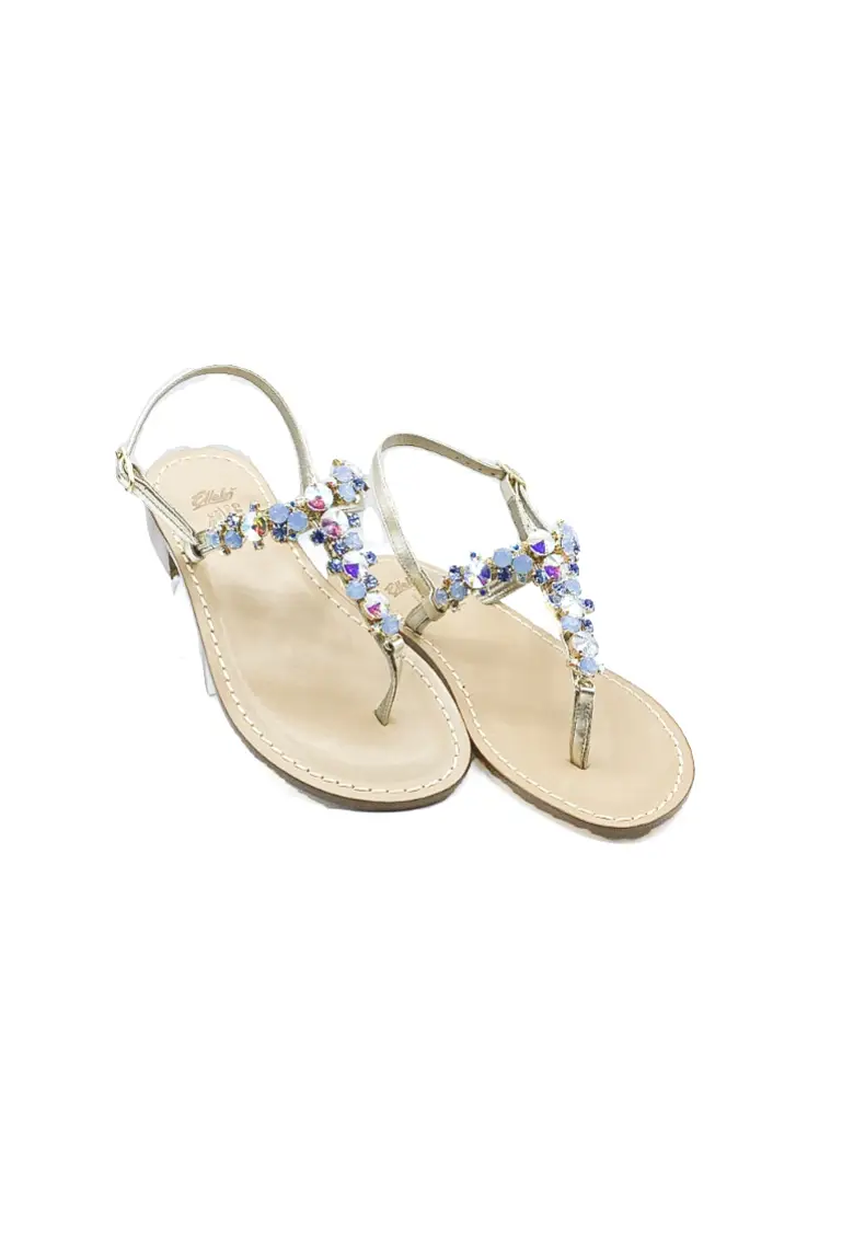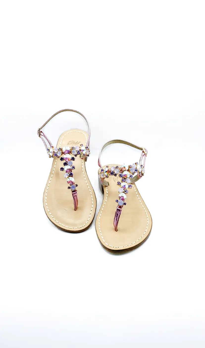 Sandali gioiello artigianali da donna con infradito impreziosito da pietre e cristalli. Tomaia in vacchetta, plantare in cuoio, fondo in cuoio e tacco 30.