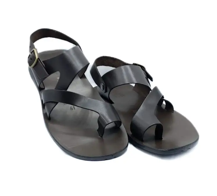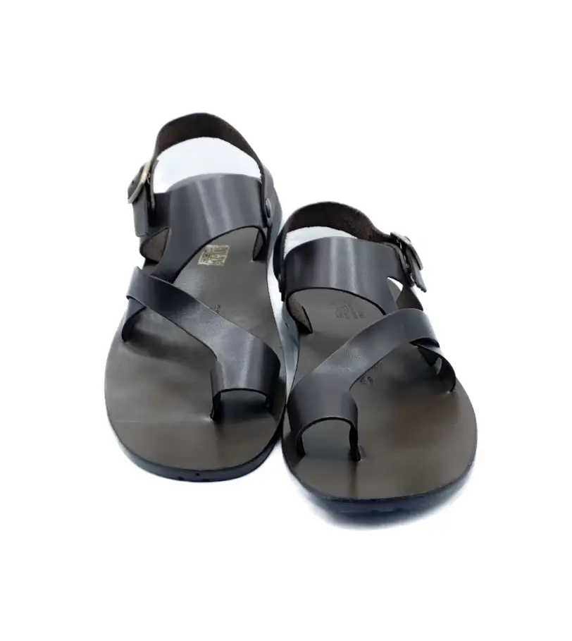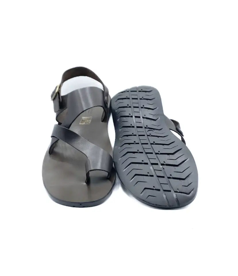 Ремесленные мужские сандалии с закрытой пяткой и перемычкой для большого пальца. Верх из кожи, анатомическая стелька из кожи, подошва из резины и застежка с ремешком на пятке.