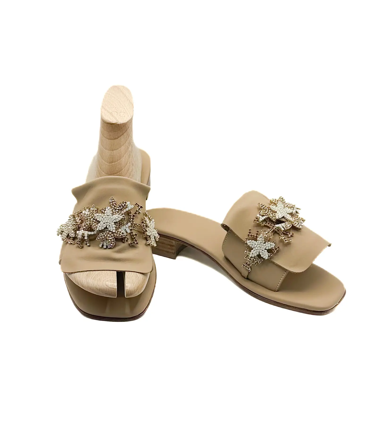 Кожаные шлепанцы ручной работы, украшенные элегантным аксессуаром в виде морских звезд. Изысканные, сияющие и идеально подходящие для летних образов.