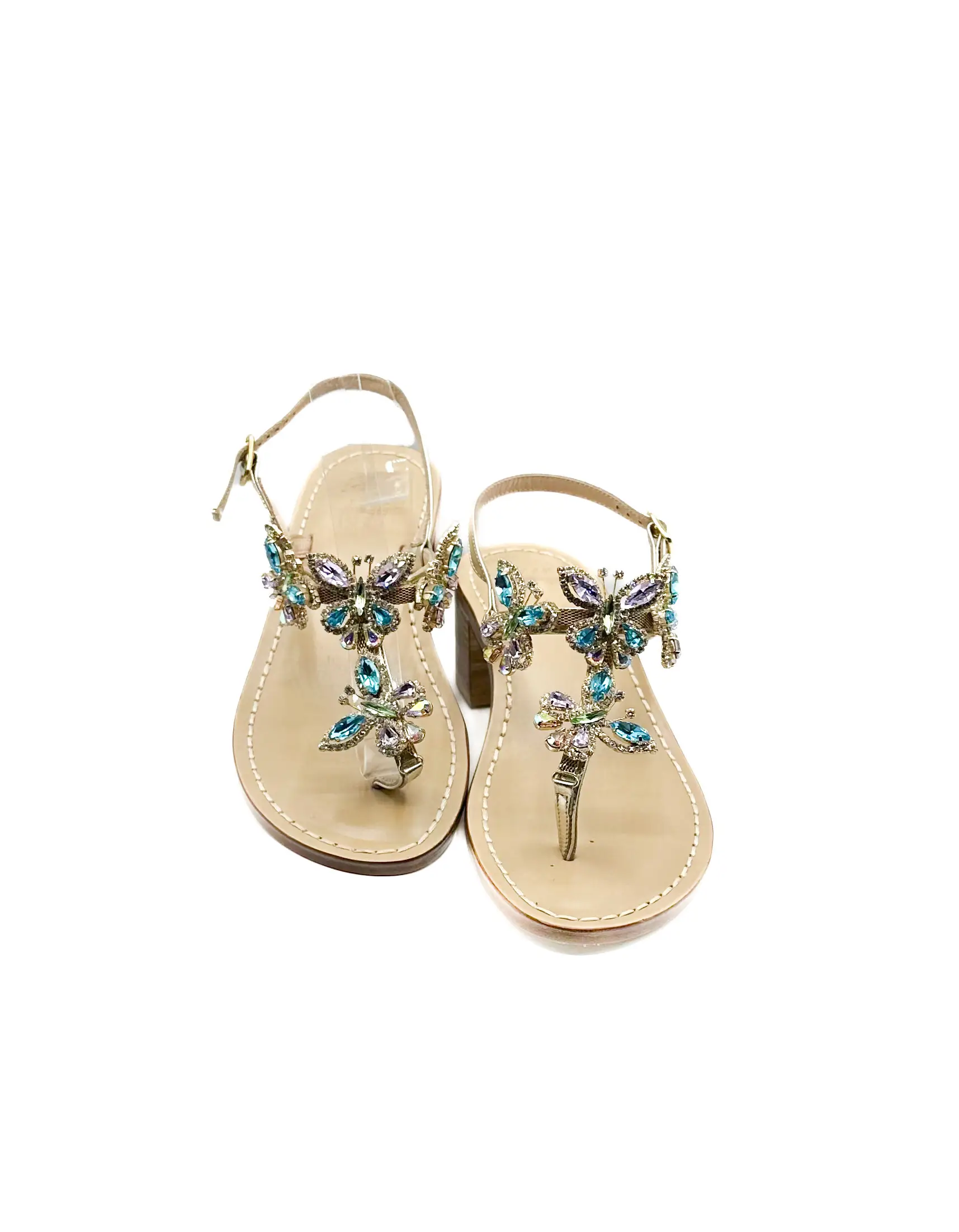 Женские ювелирные сандалии ручной работы с простыми вьетнамками, украшенные бабочками из камней и кристаллов разных цветов. Верх из мягкой телячьей кожи, стелька из мягкой кожи и подошва из кожи с каблуком 50.