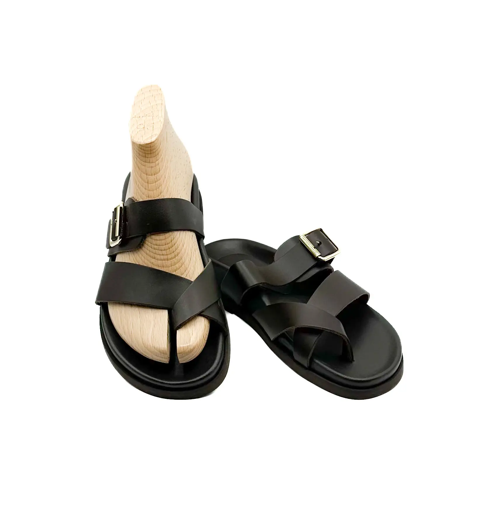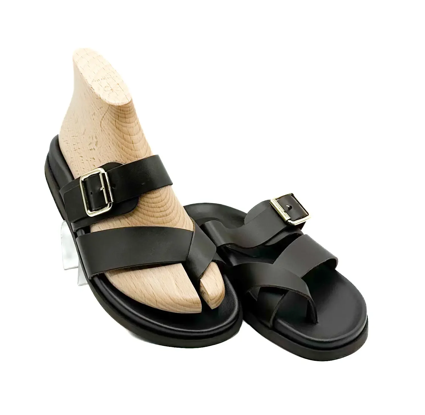 手工女式皮革大脚趾套环拖鞋,配可调节搭扣,旨在提供稳定性和精准的贴合感。解剖型鞋垫确保支撑柔软,适合日常穿着,实用且优雅。