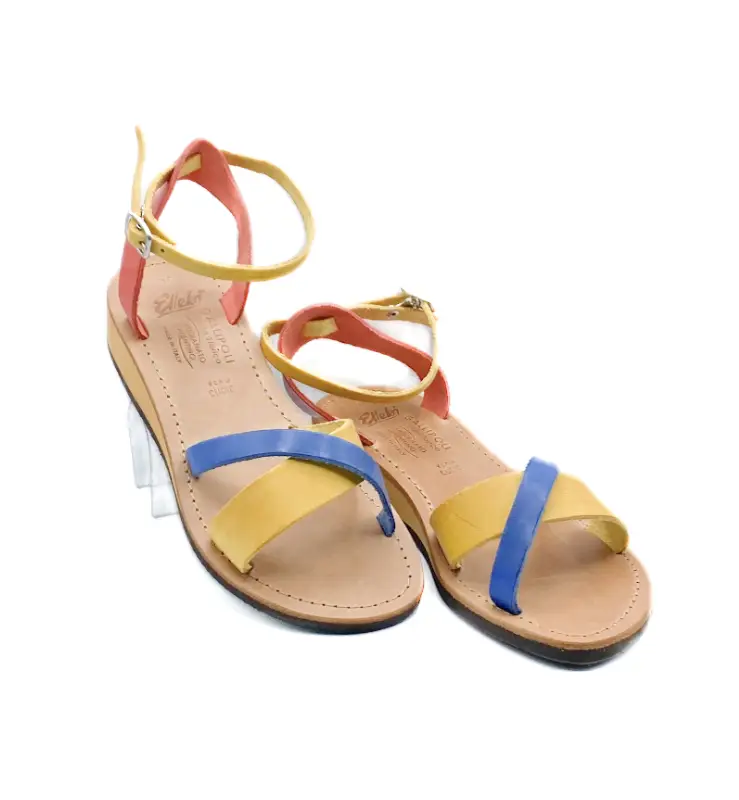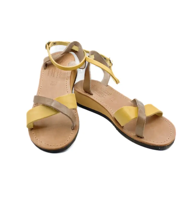 女士手工交叉带凉鞋。小牛皮鞋面,皮革鞋垫,脚踝带扣设计,3厘米坡跟。